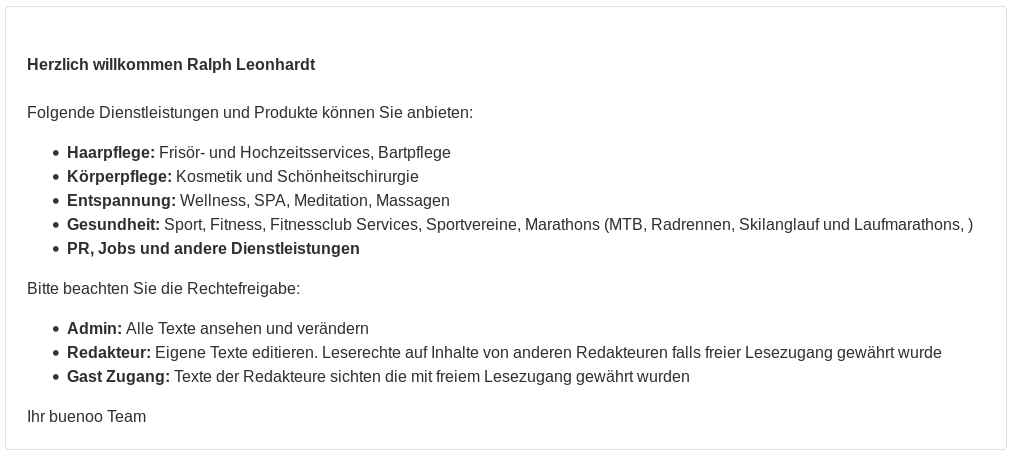 Sie können auf buenoo: Dienstleistungen und Produkte vorstellen und verkaufen, Terminkalender je Mitarbeiter erstellen und Termine von Interessenten erhalten, Neuigkeiten, Events, Stellenangebote, Aktivitäten und vieles mehr veröffentlichen.